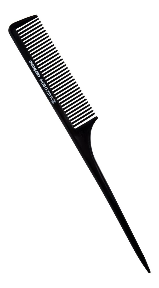 Pente profissional de carbono com cabo pontiagudo. Indicado para as mais diversas finalidades: desembaraçar, separar mechas, pentear. Uso profissional ou doméstico. Material resistente e de fácil higienização. Resistente à substâncias, como tinturas, químicas, entre outros componentes.